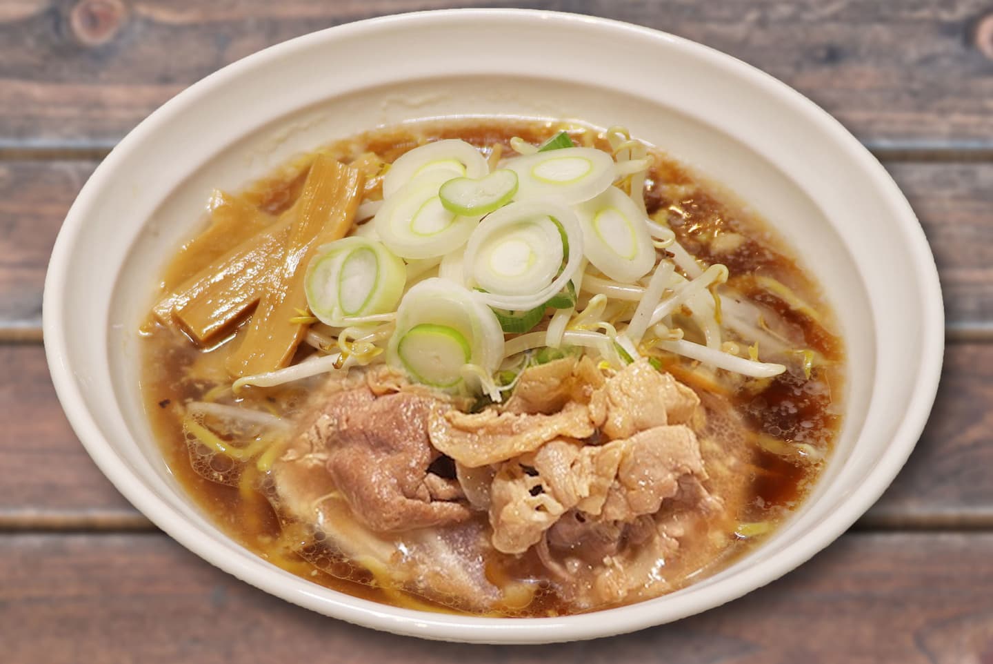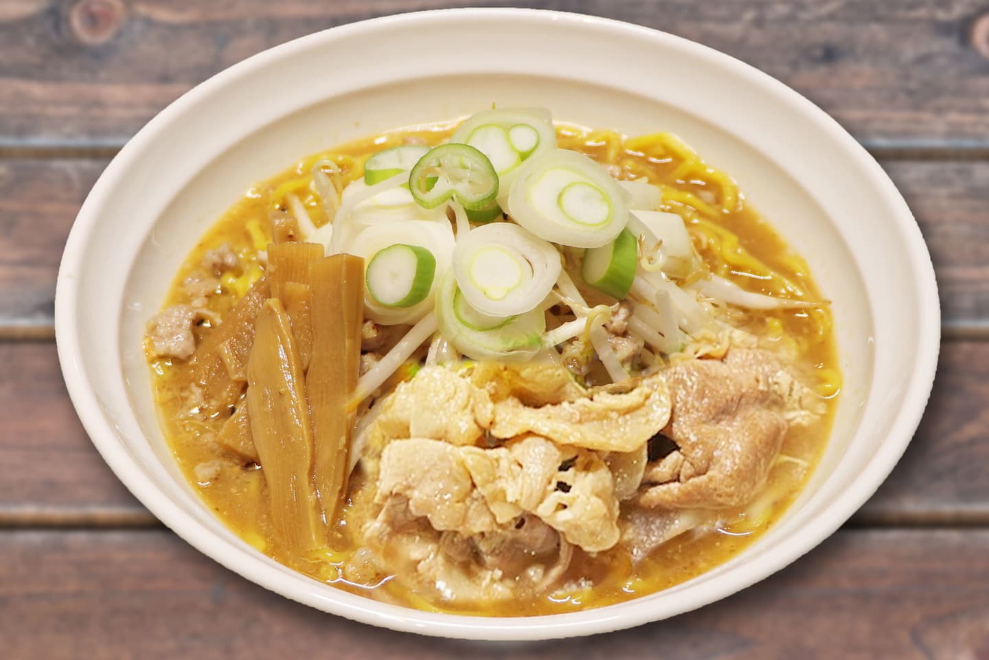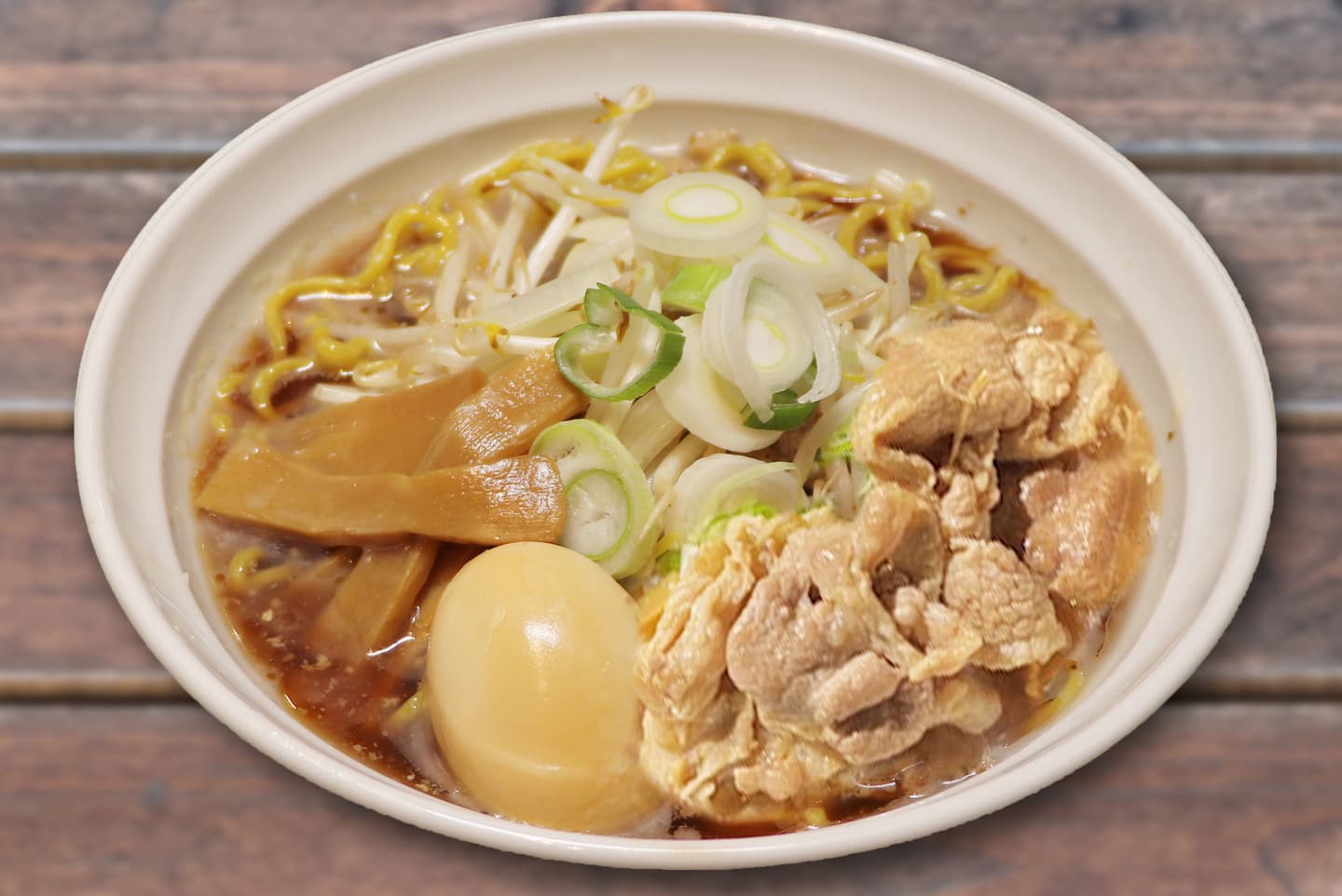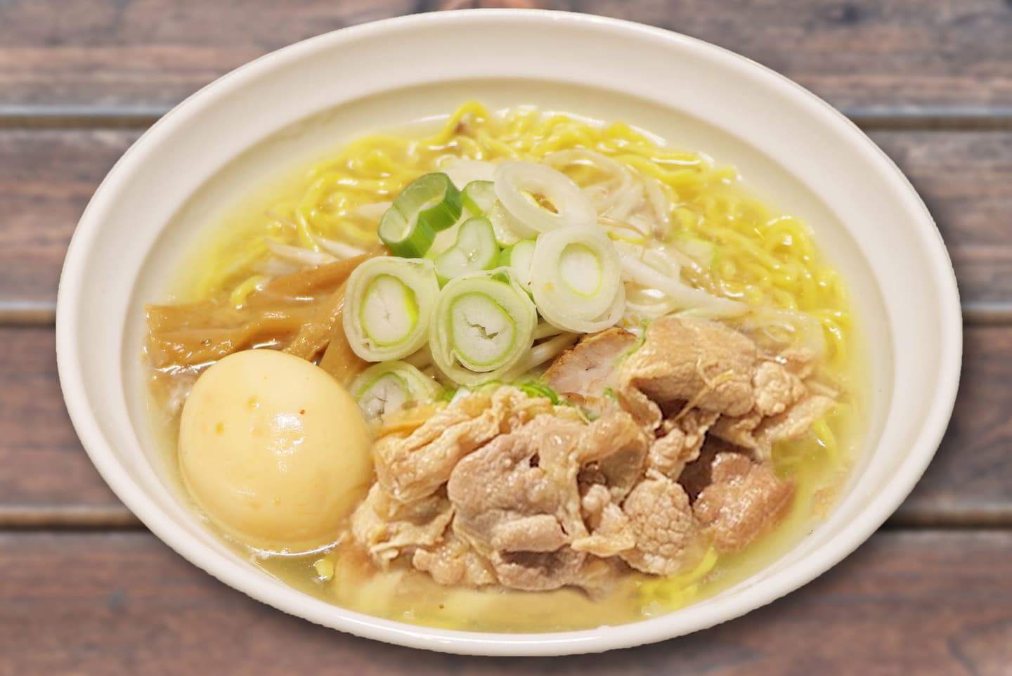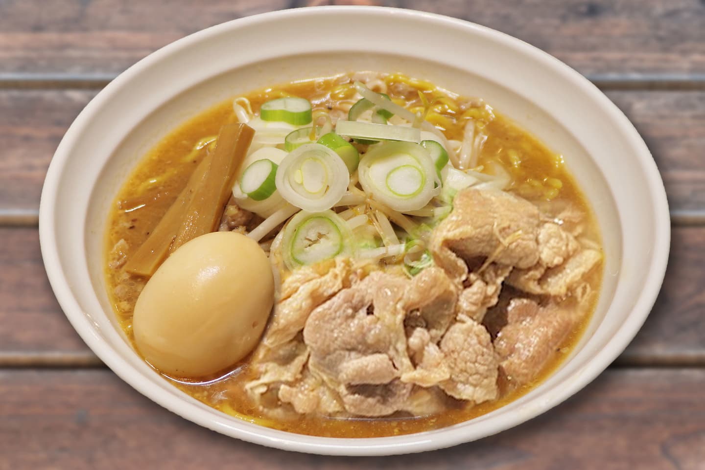 チーフスタッフが幼少の頃から慣れ親しんできたサッポロラーメンの味を、秋田のみなさんにもぜひ楽しんでほしい。そんな想いから始まったラーメンづくりでしたが、紆余曲折を経て秋田の厳選素材で仕込んだスープ+北海道産麺を使いようやく完成させました。麺はサッポロラーメン伝統の熟成中太ちぢれ麺を使用し、肉は十文字のブランド豚「十豚」でつくり、味玉は横手市の東海林養鶏場のたまごでつくっております。