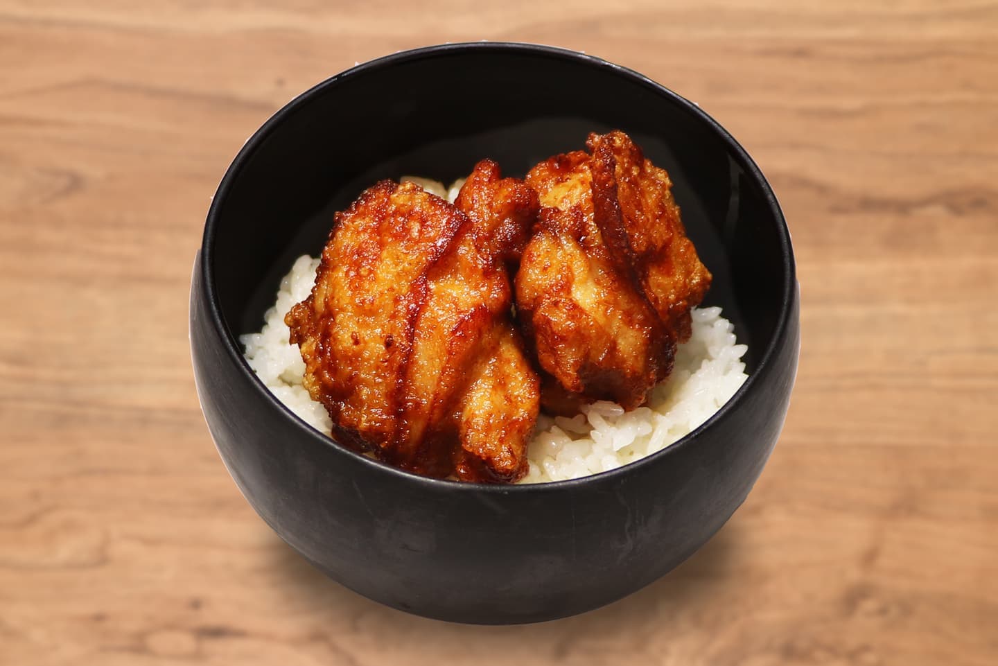 北海道の名物料理ザンギをごはんにのっけました。ザンギは、一般的な鶏の唐揚げと比べ味付けが濃いのが特徴です。